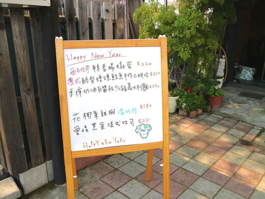 ▼戶外可見立式招牌,上方寫著最新推薦的餐點料理: