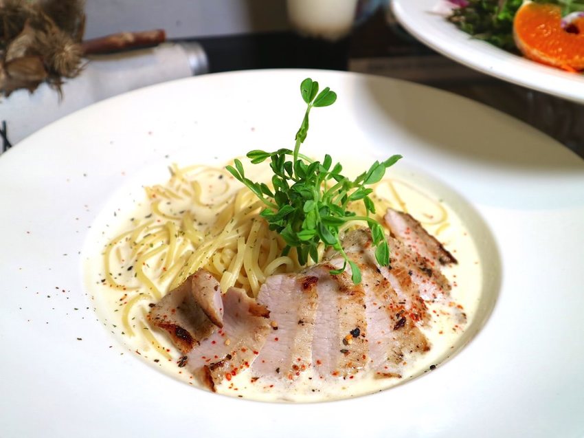 ▼《香檸奶油白醬義大利麵+香煎松阪豬(每日限量) $270》