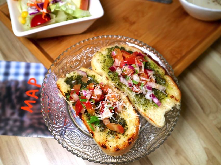 手工麵包切片微烤、塗上自製羅勒青醬、再加上莎莎醬蔬果丁、乳酪起司絲,是道營養均衡又健康的麵包料理,異國風的搭配,吃起來很清爽特別~
