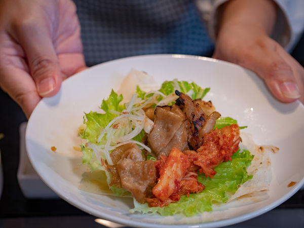 運用烤餅皮,鋪上新鮮生菜,放上剛烤好的主菜
