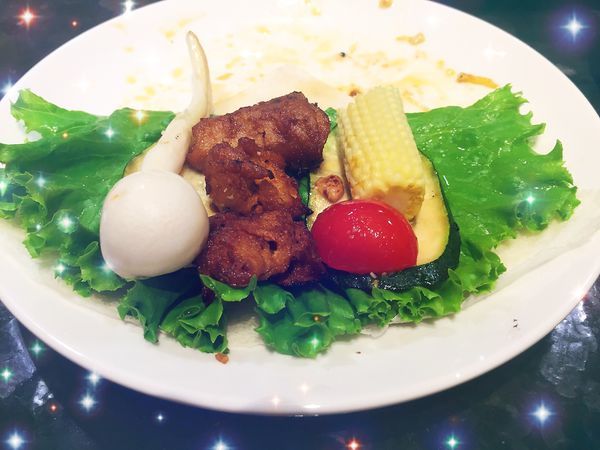球芽甘藍、酥脆雞皮、客家小炒、雞腿卷、新疆羊肉串、三杯雞腿菇、隱藏烤料