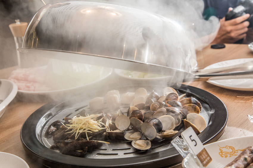 蒸鍋拿起來的瞬間,蒸氣瀰漫,海鮮香氣四散,在裊裊白煙中,海鮮的美味誘人模樣在霧氣中逐漸出現