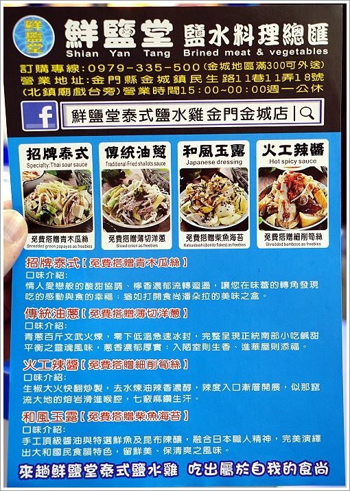 清爽美味的鹹水雞竟然從高雄夯到金門來啦!「鮮鹽堂泰式鹹水雞」金門金城店就位於金門縣金城鎮民生路巷弄內、北鎮廟戲台旁,雖然剛開幕沒多久又隱身在巷弄內,但獨創的四種醬料搭配多元的食材還是吸引不少饕客前往!除了獨創的招牌泰式口味之外,還有傳統油蔥、和風玉露、火工辣醬等共四種口味,不僅醬料非常有創意,食材也比一般傳統鹹水雞豐富許多,像是科學麵、雞胗、雞皮、雞冠、雞卵、雞心、豬耳朵、豬脆腸、黃金魚蛋、飛魚卵腸等特色食材通通應有盡有,搭配醬料吃起來別有一番風味!其中泰式風味是全台首創,酸甜開胃的醬料頗受歡迎,辣度也可以另行調整;大口本身則是很熱愛傳統油蔥口味,感覺比一般鹹水雞多了一股蔥油香氣,相較於外頭胡椒味較為濃厚的鹹水雞來說,更加清爽涮嘴啊!