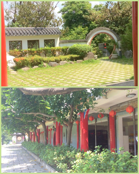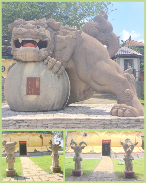 九龍池和二隻石獅和一對蓮花燈。