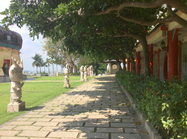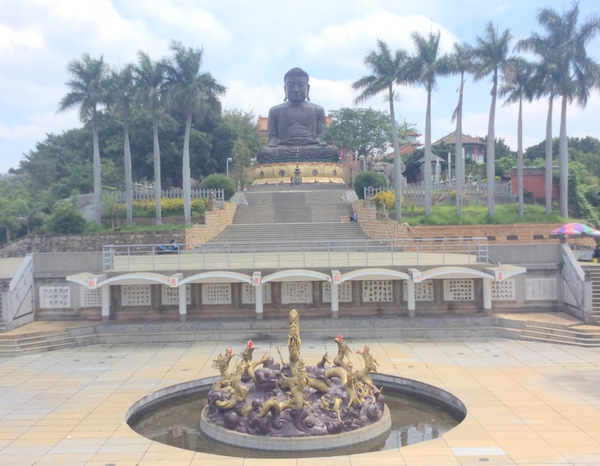 石雕觀音豎立兩旁,參佛大道盡頭即是九龍池廣場。