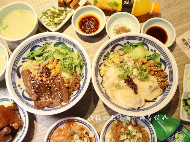沙拉點了2個虎夠厲害套餐拿到時就會像這樣,一碗主餐麵食、38元小菜、38元飲料,另外再附一個湯及配菜,一個人吃份量超足