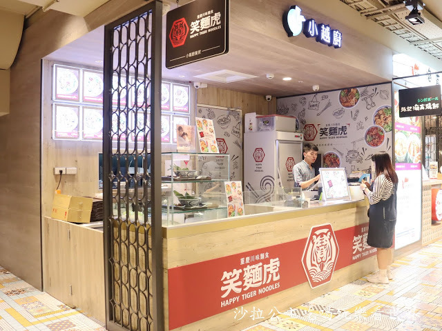 『笑麵虎重慶川味麵食』位在B1美食街,電扶梯下來往右看就會看到高掛的"小越廚",沙拉拍攝的角度就是在電梯口,所以非常好找