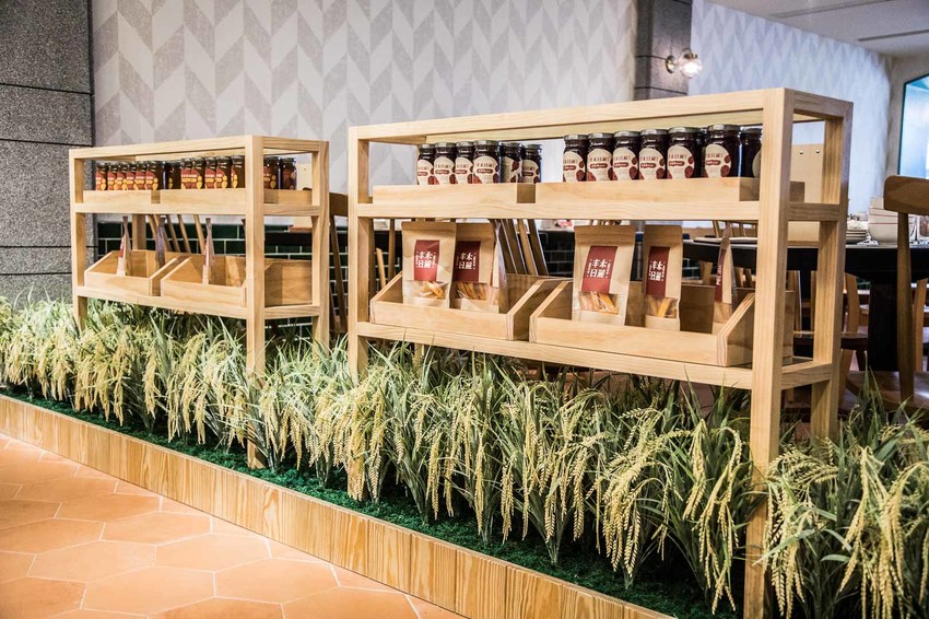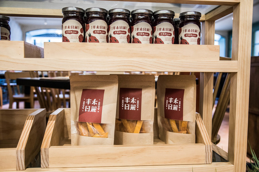 吃飽喝足還有伴手禮可以買!?在門口處丰禾日麗台式小館設置了一個果漬商品專區,這裡販售丰禾日麗台式小館品牌果漬商品,木櫃還是放在結穗稻田造景裡,象徵風和日麗萬物豐饒的意境