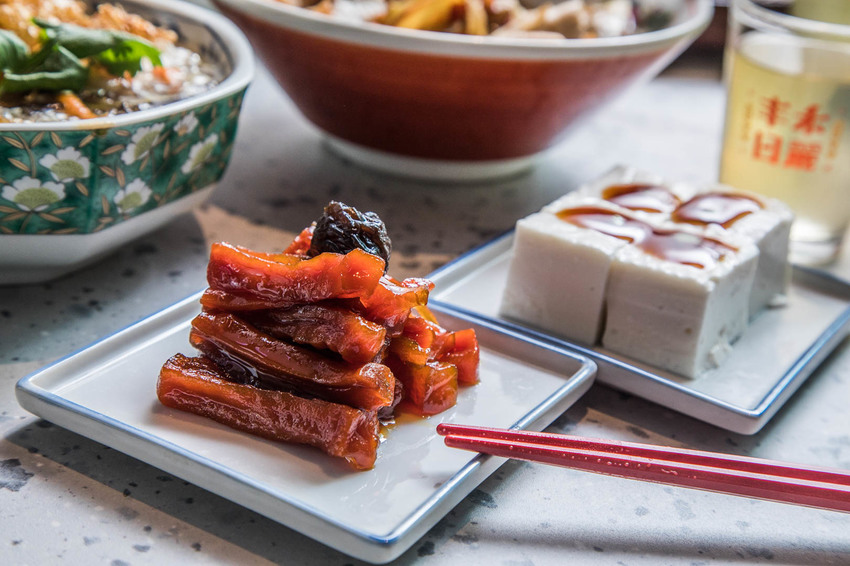 超搞工的功夫菜,府城肉燥芋糕遵循古法,芋頭切絲加上地瓜粉、鹽、肉燥製作成方形,再將油蔥酥拌入肉燥,蒸煮後放涼再淋上醬油膏,正方形的外觀頗為討喜,還飄著濃郁的肉燥香