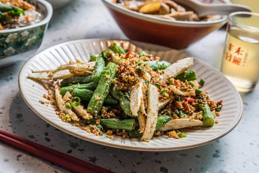 主廚將茭白筍、長豆切長條,再加入蒜酥、辣椒末爆炒,一上桌四周瀰漫著濃郁的蒜香