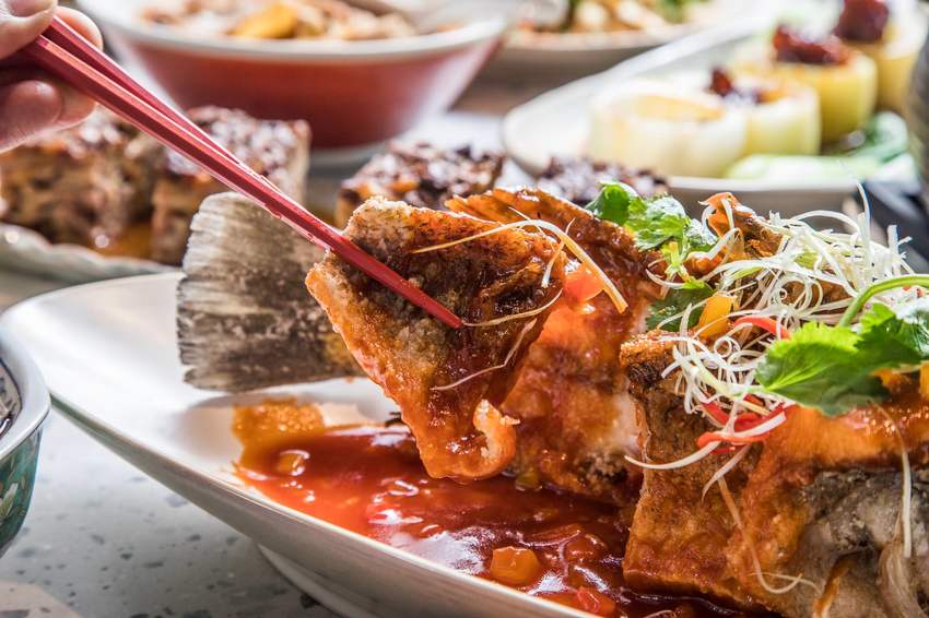 嚴選大尾新鮮鱸魚,魚身先用刀工片開,再下鍋油炸定型,糖醋醬汁主廚也經過改良,淋上獨家果香糖醋醬汁,果香濃郁酸香