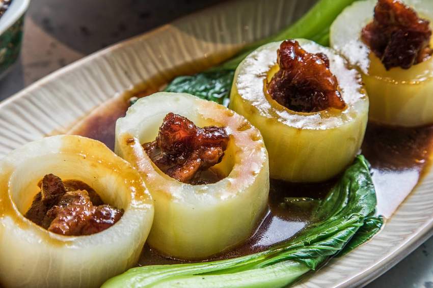 主廚將將紅燒滷製的豬膝韌帶鑲入煨煮過大黃瓜之內,豬膝韌帶一隻豬只有四個,算是非常珍貴的食材,紅燒豬膝韌帶透著滷汁紅艷的色澤及醬香