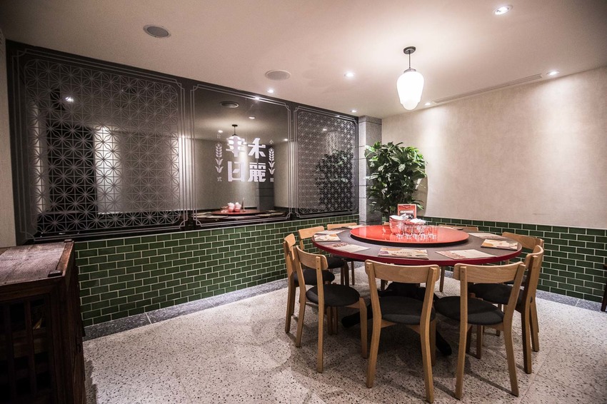 丰禾日麗台式小館的門面跟候位區,同樣融入許多復古的老宅元素,候位區擺了張小皮沙發,候位區是擺上好幾張木圓凳可以讓客人們坐著候位,後方也是用花磚牆,門口處兩片沉重復古味十足的大木門,貼著丰禾日麗的字樣,電動門也是用小時候常見到的綠色毛玻璃拉門,只能說王品真的連小細節相當注意呢