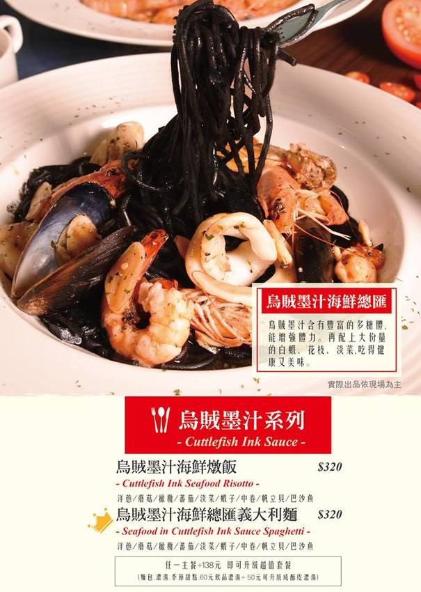 ▼菜單,他們家的餐點選擇還不少,有湯品、沙拉、義大利麵、排餐、窯烤披薩、焗麵、焗飯、小點、飲品、兒童餐,另外點主餐還可以加價138元升級為超值套餐,就能享用麵包、濃湯、甜點、60元飲品,保證吃得飽足又滿足!文末還有詳細的圖文版菜單,提供給有興趣的朋友參考!