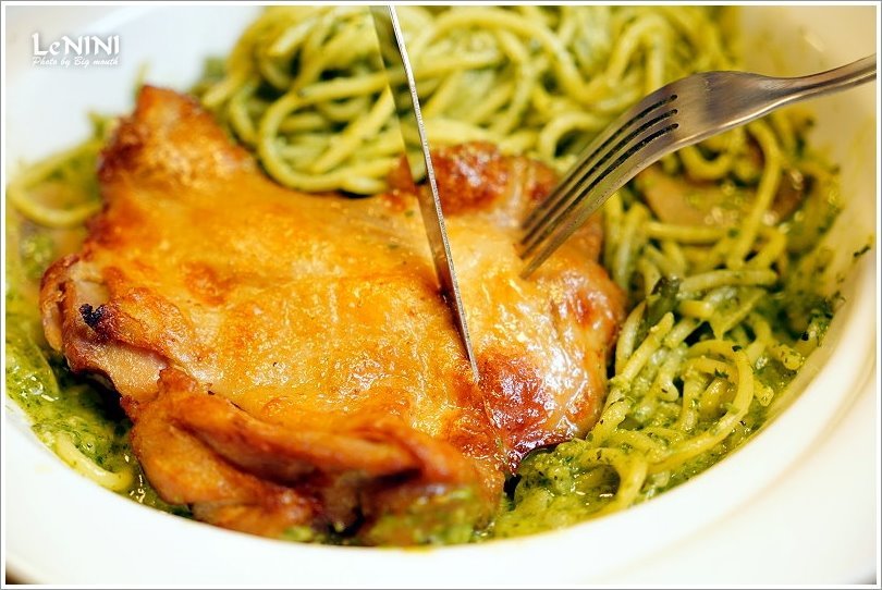 ▼青醬香烤雞腿排義大利麵,也是點餐率非常高的一道餐點唷!雞腿排採用蒜、多種香料等下去醃漬入味,再以300度火烤而成,看起來金黃油亮非常動人啊!