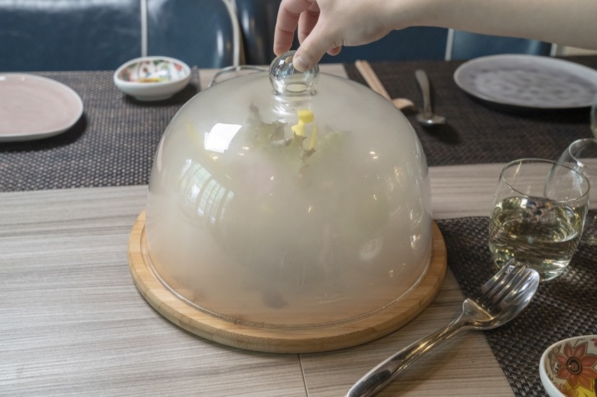 沙拉內部都是滿滿的白霧,其實店家是利用威士忌的橡木煙燻