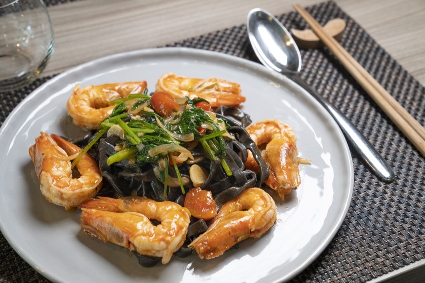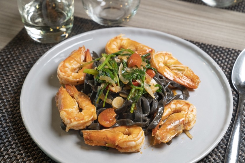 ♦ 蒜香野放大蝦菠菜墨魚麵