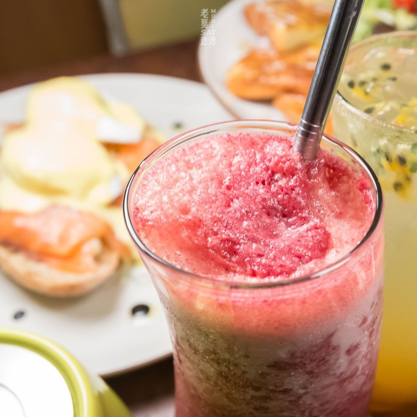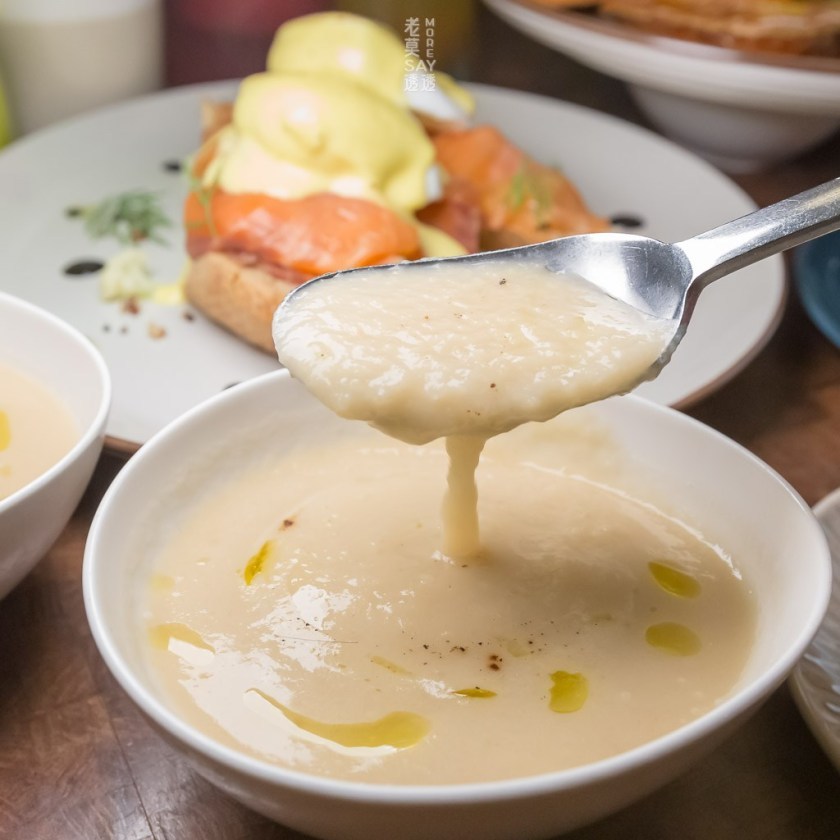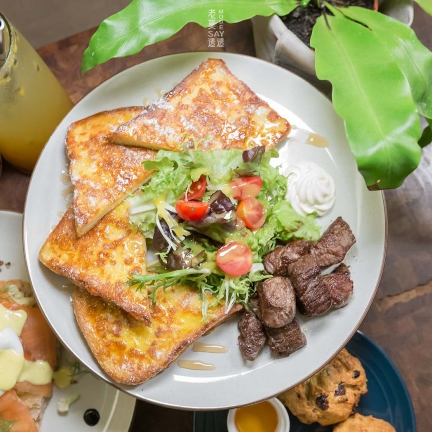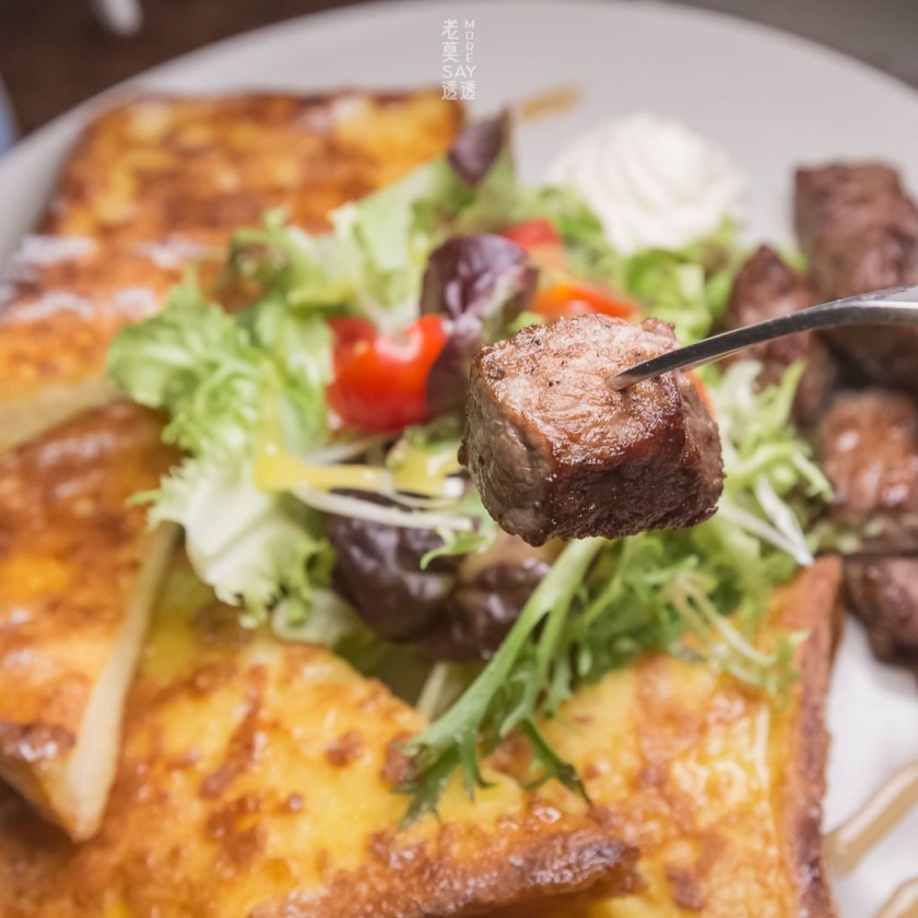↳麵包是店內自製的,用的材料是蛋、牛奶與麵粉,不加一滴水。沙郎骰子牛來是於紐西蘭的草飼牛,口感有嚼勁,有別於美國牛的軟嫩。沾醬是cream cheese+牛奶稀釋調製,與法式吐司一起食用,味道相當不錯。