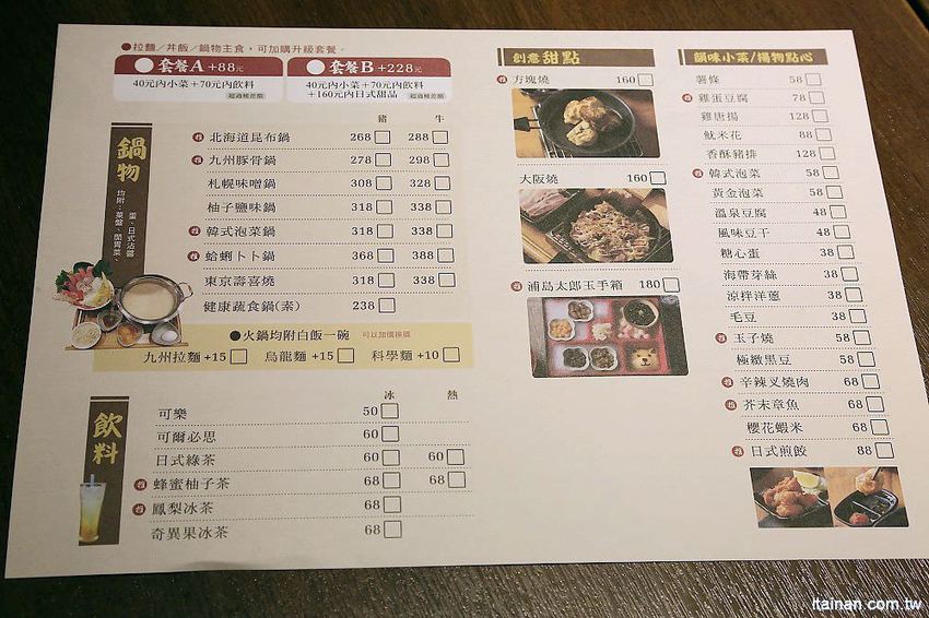主要餐點有博多拉麵、烏龍麵、丼飯定食、鍋物、揚物點心、甜點,餐點算是滿多樣化的。