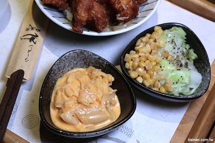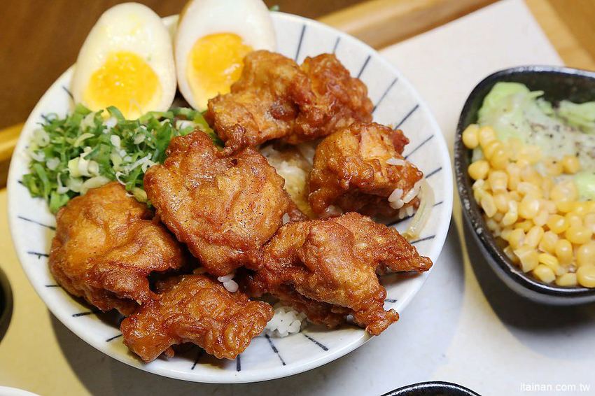 唐揚雞定食主要有:唐揚雞丼飯附沙拉、黃金泡菜、湯。