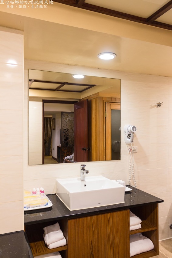 浴室門口進來是洗手/臉檯,吹風機、備品、毛巾、浴巾都很齊全。