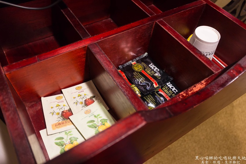 沙發旁的櫥櫃上方有熱水壺、抽屜拉開還有花果茶包和咖啡可以沖泡。
