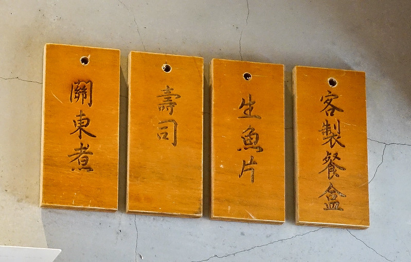 如牆上的木板, 這裡主要是各種壽司, 生魚片, 關東煮, 也有丼飯等等