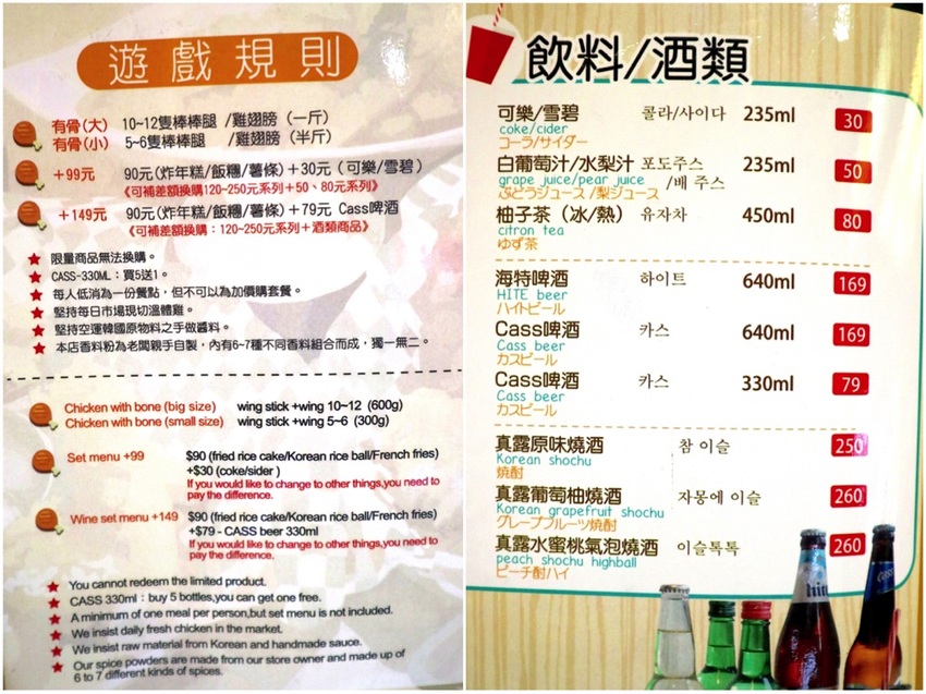 《FY韓雞寶》提供多種韓國啤酒:海特啤酒、Cass啤酒、真露原味/水蜜桃/葡萄柚燒酒…等