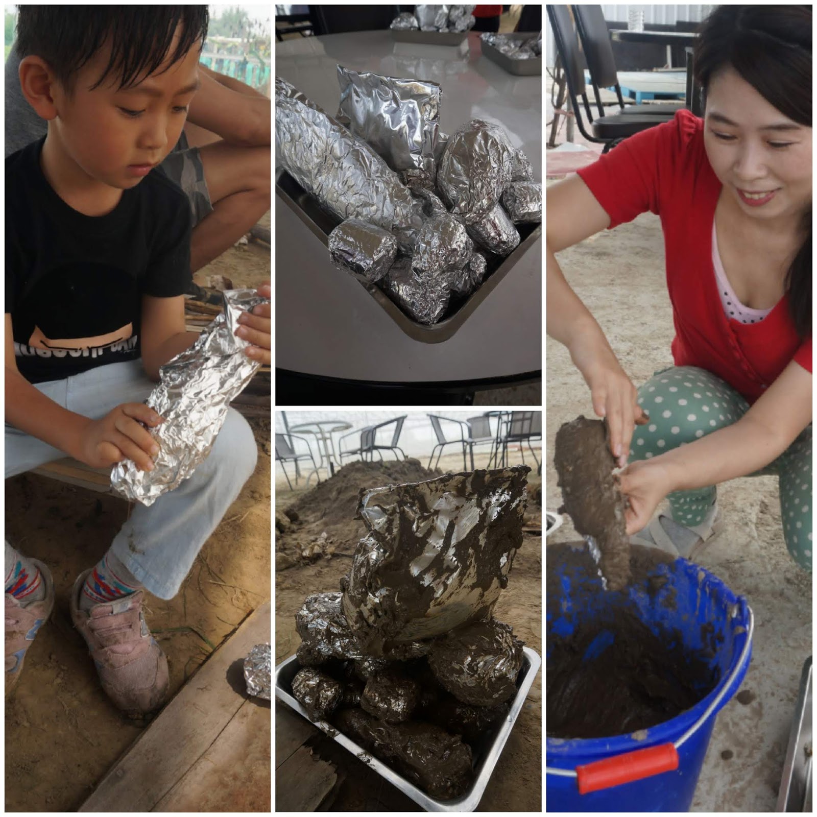 接著就是包鋁箔避免食材燙傷,然後再裹上像爛泥巴的泥土,平均塗抺食材,受熱才會均勻!臭屎蛋怕髒不敢裹泥土,屎蛋媽只好自己來,啊~我剛做好的指甲啊啊啊!