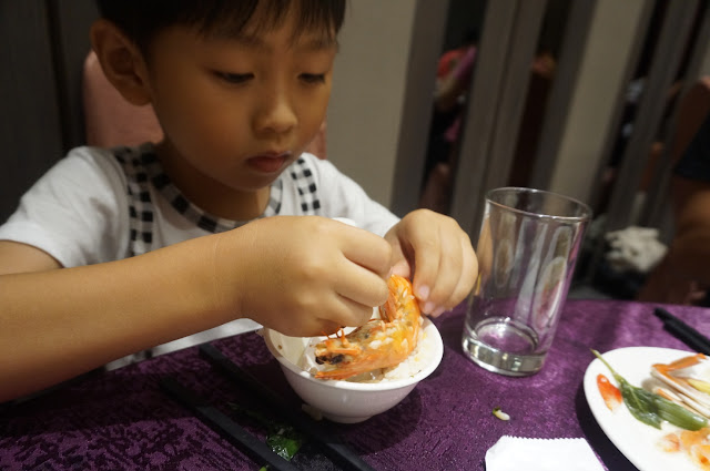 好吃到等不及屎蛋媽撥蝦,就自動自發的撥起殼來,好孩子!