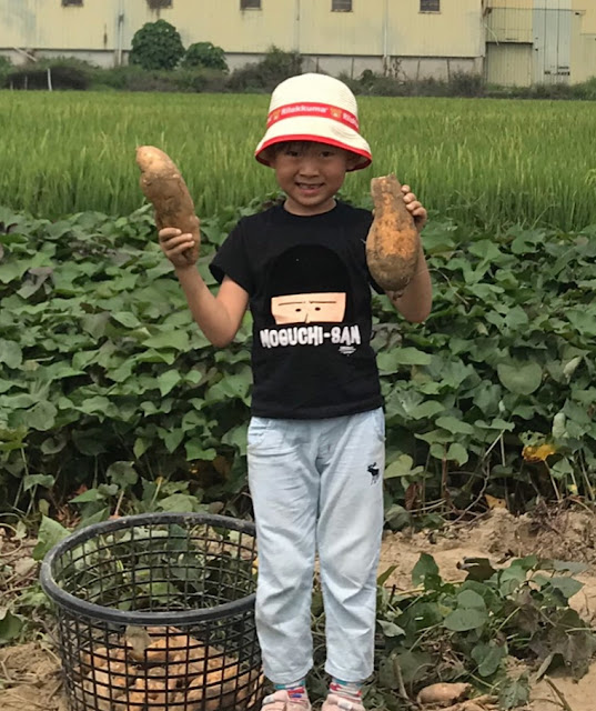 挖地瓜完準備採果,一連串的行程,讓屁孩們玩的好開心!在菜園不時的聽見槍聲,阿嬤菜園利用傳統槍聲嚇走麻雀,所以不用使用農藥等危害自然的農法,種出新鮮無毒的有機蔬果。