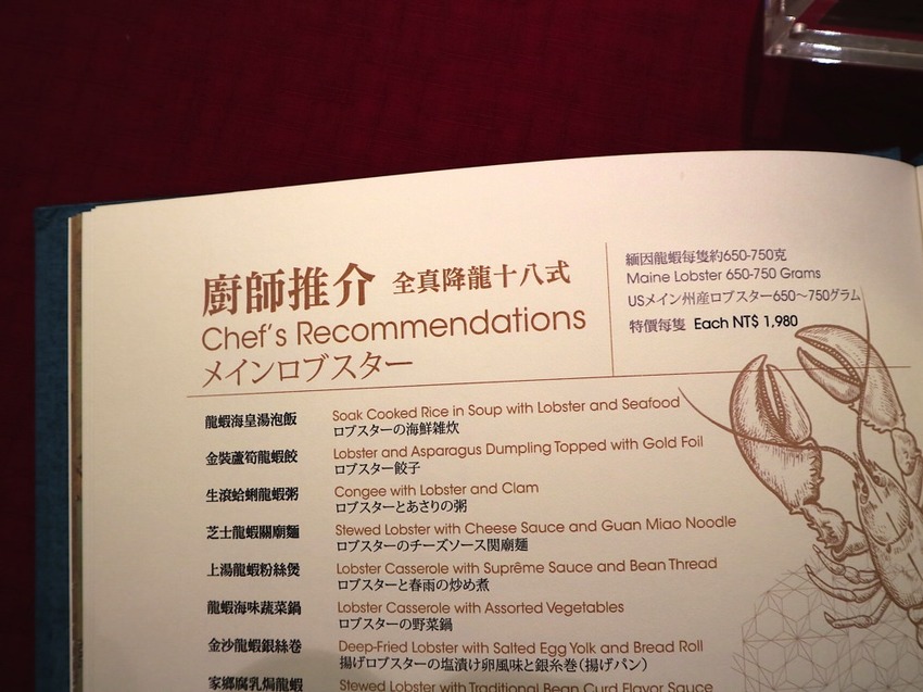 龍蝦的用餐方式比較特別,選用 每隻重約650-750公克的“緬因龍蝦”,均一價為$1980元,下方有十多種的料理方式,你可以擇一挑選你想品嚐的龍蝦料理!店員力推這道《龍蝦海皇湯泡飯》,我們就點了!