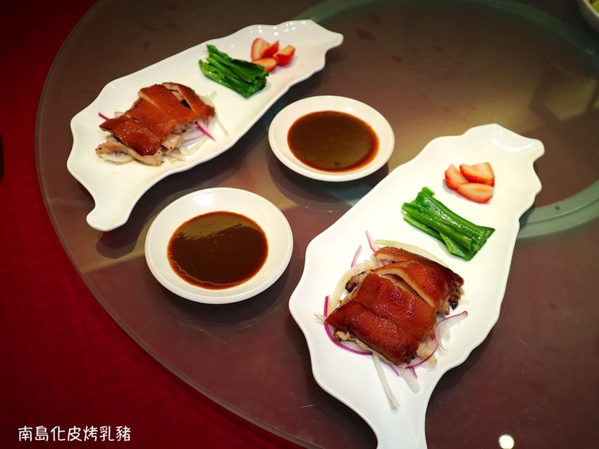 《南島化皮烤乳豬》送上,份量滿精緻的;除了烤乳豬本身外,豬肉下方還鋪了洋蔥生菜絲,另有兩種配菜和沾醬。