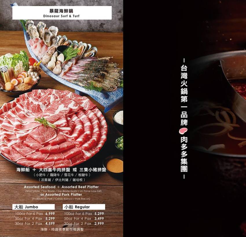 沒吃過肉多多別說你吃過火鍋!好啦~大口也是第一次吃到「肉多多火鍋」,不過第一次就來到位於台北車站附近重慶南路一段上的「肉多多火鍋」全新的二代店,不僅用餐環境充滿粉紅恐龍的都會叢林感,搭配清新的白、綠色系感覺格外明亮又舒適!除了湯頭多元之外,餐點選擇也是不少,像我們這次點的雙人海陸分享餐就有超大肉盤加上澎湃的時令海鮮盤,雙人份的菜盤與附餐更是讓我們飽到天靈蓋;重點是還會額外贈送兩盤肉品,另外還有冰淇淋、飲料、甜湯、咖啡、醬料等通通都是自取吃到飽,讓我們吃得超級過癮又飽足!而且這裡的服務更是一級棒,除了有球池、玩具之外,還有提供剝蝦殼、生蠔脫殼服務,另外也會教大家如何涮肉片最美味,真的是超大心的啦!