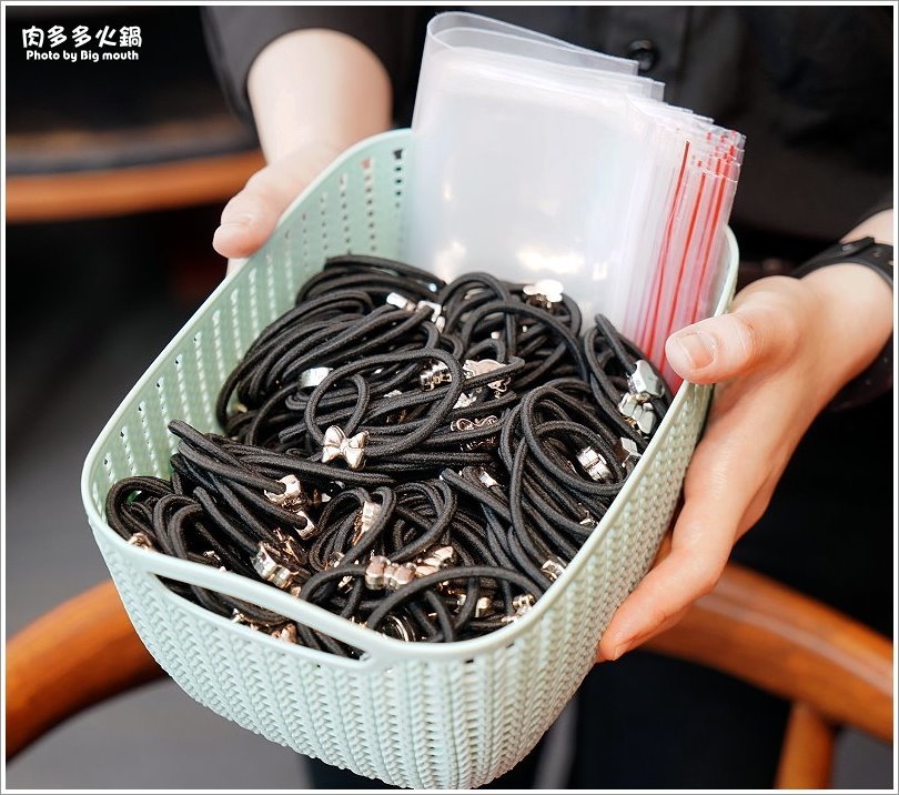 ▼沒多久服務人員就拿出一藍物品,仔細一看竟然是綁頭髮的髮圈跟夾鏈袋,原來是要讓有需求的女孩兒將頭髮綁起來以方便享用火鍋,夾鏈袋則是可以將手機放進去以免湯頭潑濺在上頭,只能說他們的服務真的超級貼心啊(加分加分)!