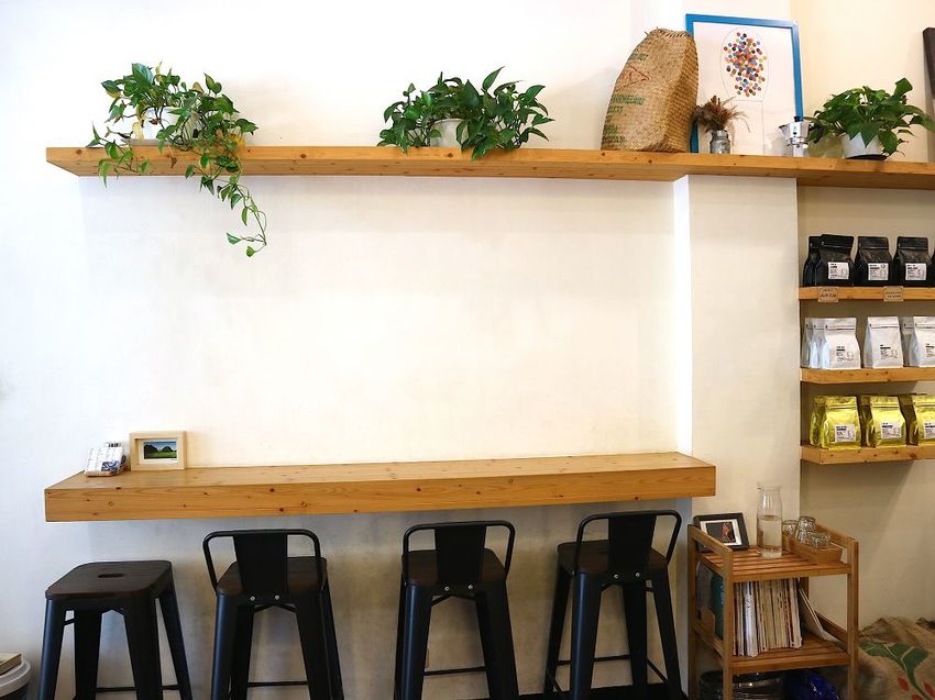 咖啡店內部空間較方正小巧,左邊是一整排的吧台區,右邊則有兩張圓桌。
