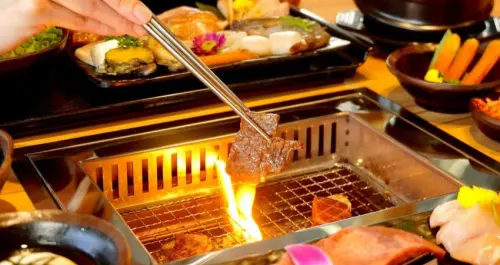 美國肋眼沙朗、美國頂級嫩汁牛肋條、炭烤蔥燒牛舌、炭烤草蝦小時候、起司烤生蠔、炭燒骨付香腸、西班牙伊比利豬五花,通通吃到飽。