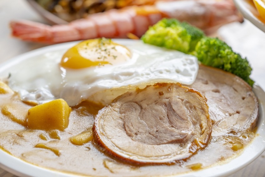 有一顆療癒的半熟蛋與圓滾滾超美油花叉燒肉片~