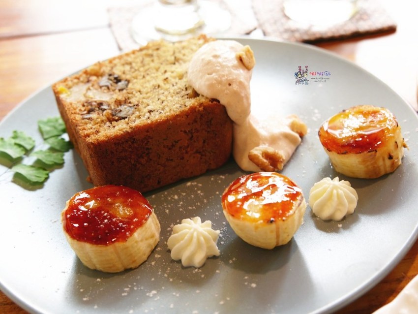 另外阿寶喜歡的是香蕉核桃磅蛋糕,一大塊的磅蛋糕旁邊還放了三片焦糖香蕉。