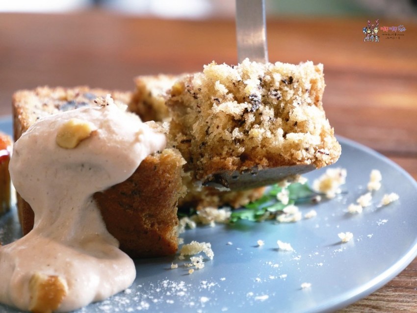 我自己是沒那麼喜歡磅蛋糕的,因為自己做過就知道磅蛋糕的熱量…嘖嘖嘖。磅蛋糕又叫做旅行蛋糕,因為他是適合帶出門旅行的蛋糕,不需要放冰箱冷藏,常溫就可以吃了,為了方便保存裡面放入大量的油和糖,喜歡的人就很喜歡,像是哪哪婆就偏愛磅蛋糕。而且做好後要放著到第二天第三天,讓裡面的各種材料味道和香味更融合之後會更好吃。不過店家說他們的甜點都有經過減糖減油,負擔會比一般磅蛋糕來的更少些,味道也相對比較清爽。