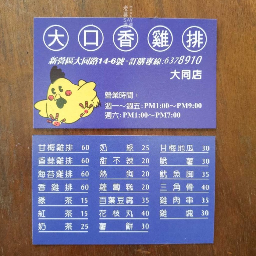 有到新營,一定要到新營火車站附近的大口香雞排,嚐嚐多汁酥脆的炸雞肉串,每串只要銅版價$35,網民譽為新營美食必吃美食。對鹹酥雞有一份堅持的你,一定不能錯過,就在新營大同路上。
