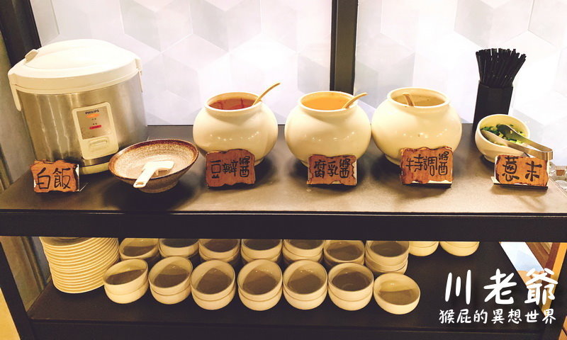 醬料跟白飯是自助式,白飯要吃幾晚自己裝,醬料有豆瓣醬、腐乳醬、特調醬跟蔥末