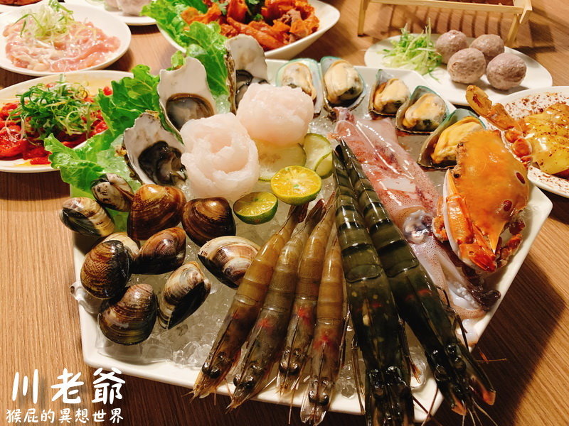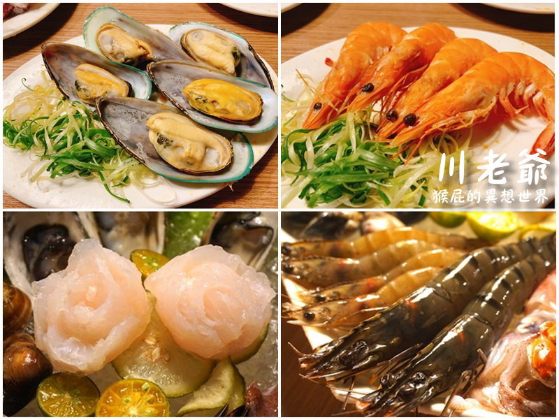 有螃蟹、大生蠔、大海老、白蝦、蛤蠣、玫瑰花魚片、特選透抽、頂級淡菜