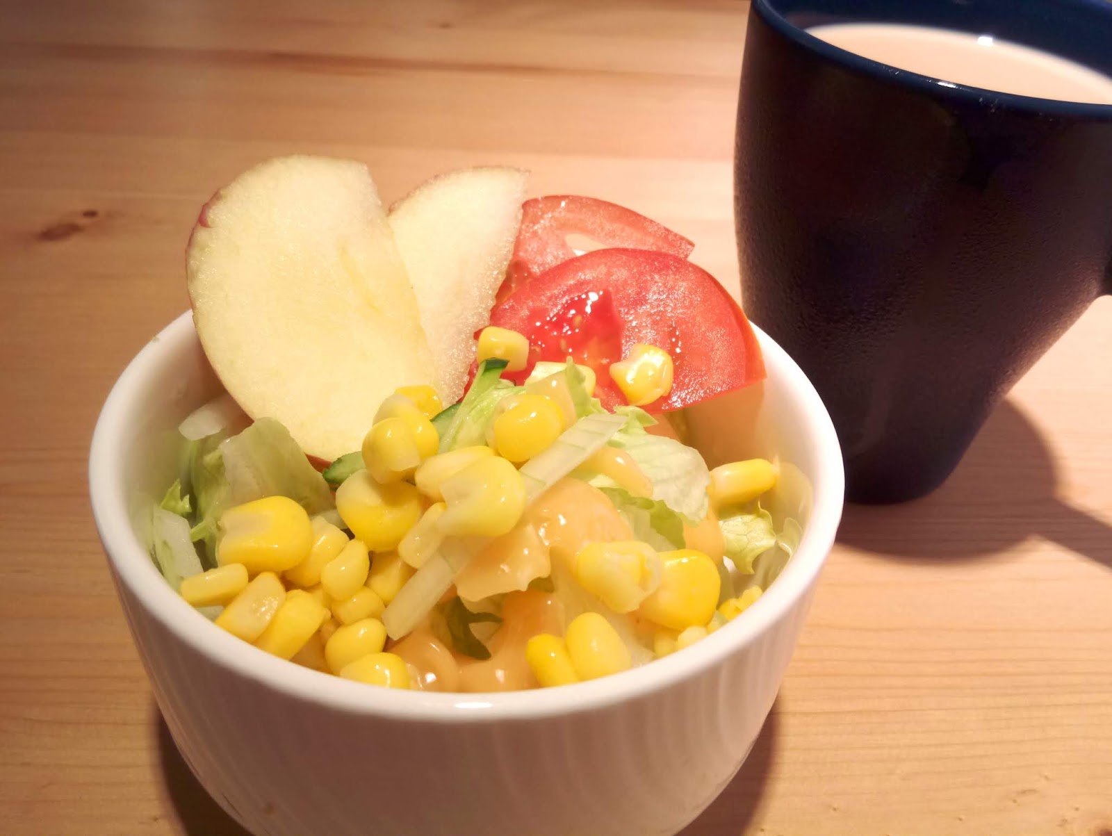 套餐的生菜很新鮮,有生菜、玉米、洋蔥還有蘋果番茄,醬料使用千島醬。