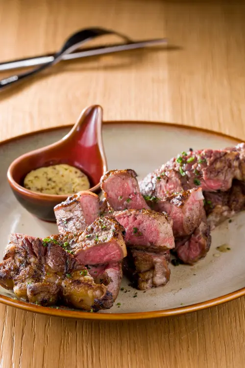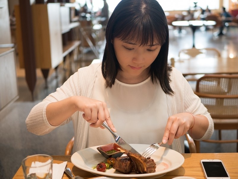 Que原木燒烤餐廳的羊肉豬肉都是採取無菌飼養,所以不吃全熟也沒關係,是很特別的體驗,法式羔羊排口味有很多層次感。我先從調味料較少的地方切下去,可以吃到羊肉最原始的風味,羊肉的濃郁香氣都有維持住,第一口體驗就有好的開頭。