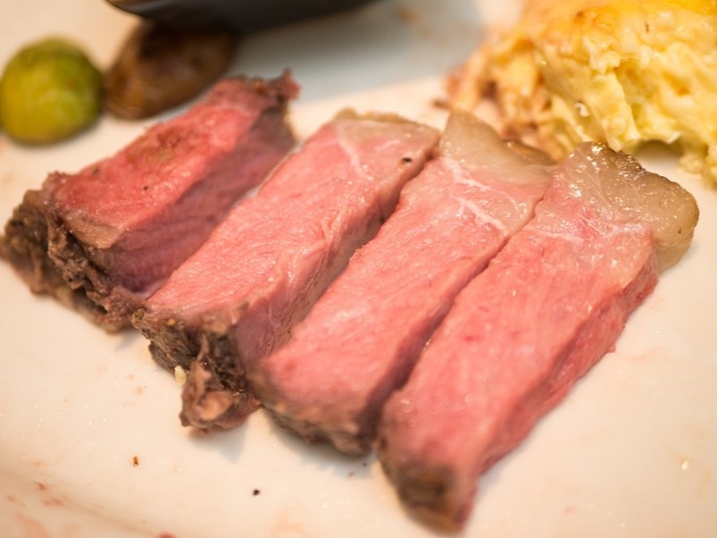 再來從調味料較多的地方開吃,超~級~美~味~肉表面上的醬汁以及胡椒鹽,讓整體的香氣更加濃郁有味道,比起全熟,七分熟的口感更加軟嫩,也很與眾不同。