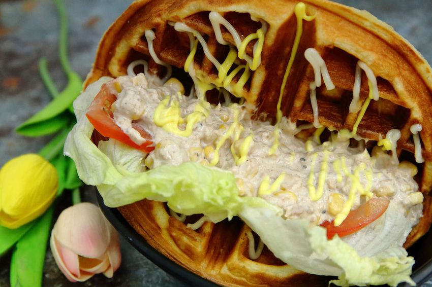 超好吃拉!!!蓬鬆的鬆餅吃起來一點也不乾,吃起來外酥內軟,特調的鮪魚醬吃起來很香不會太鹹