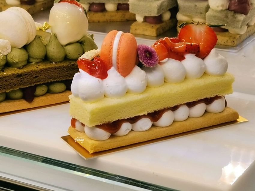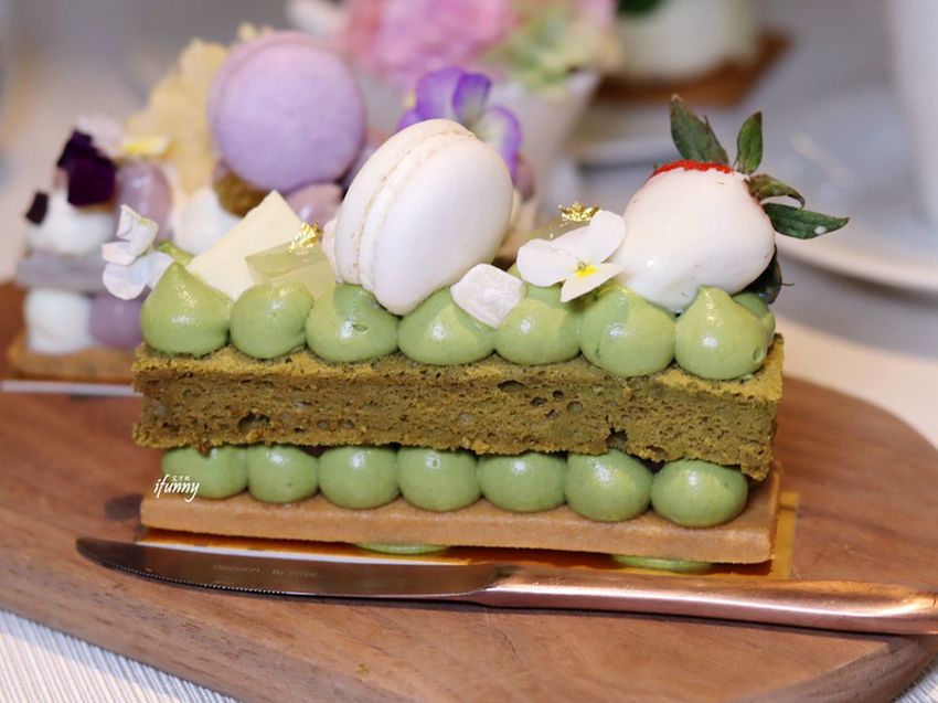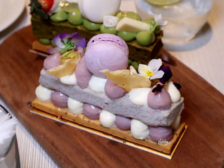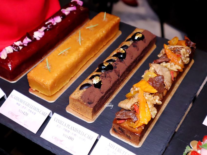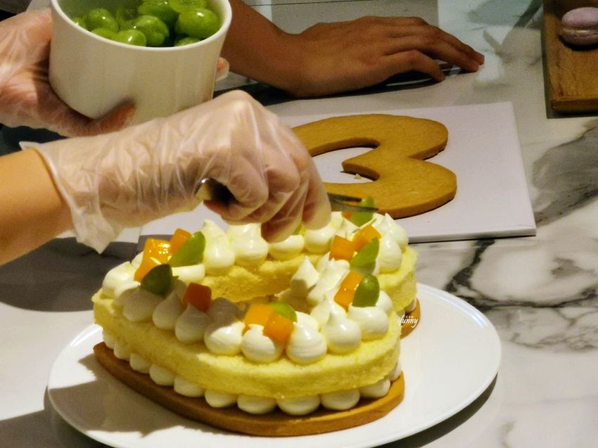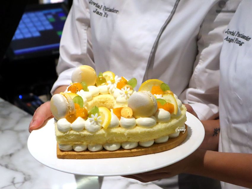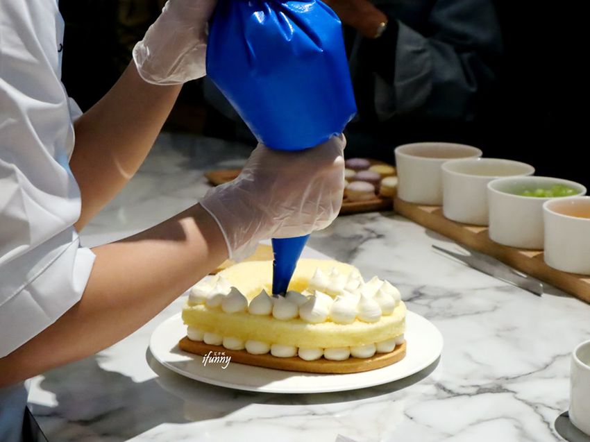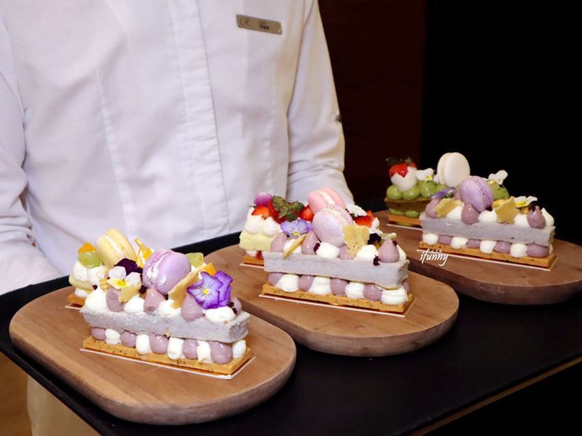 這天現場製作個人份的長型字母蛋糕四種口味皆有,以手工酥餅、風味鮮奶油及戚風蛋糕組成,再飾以水果、馬卡龍、茶凍及食用花等,華麗中有著少女心。其中芋頭及芒果,更是採台灣在地的食材,是在香港也吃不到的滋味。