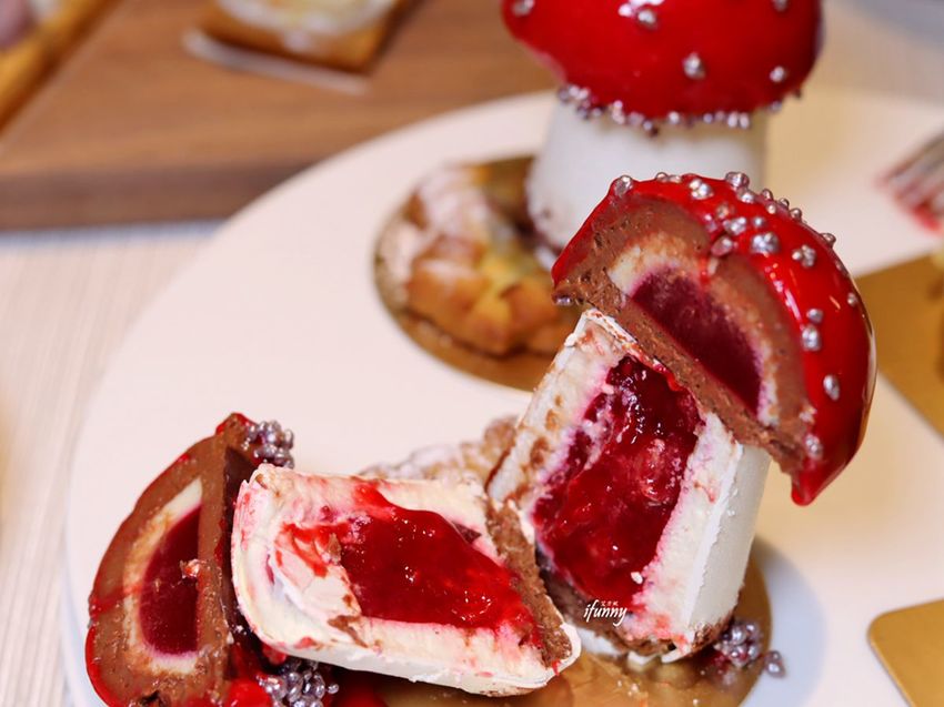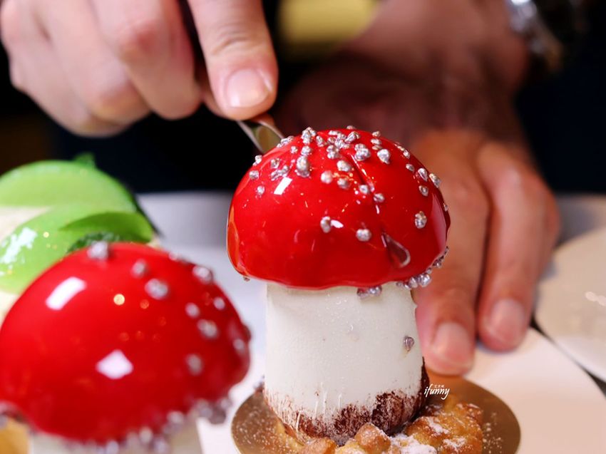 經剖半後,蘑菇頭是苦甜巧克力慕斯,包覆糖煮覆盆子,其下則是白巧克力慕斯、香草奶油及覆盆子果泥,多層次的酸甜交織,令這款甜點令人相當有記憶點,是我們當天最喜愛的一款。