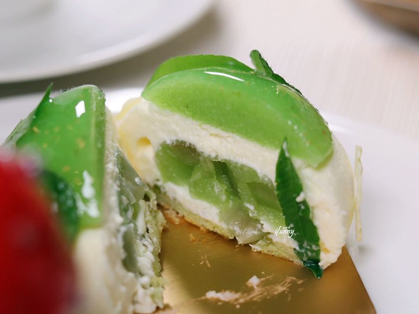 以白巧克力慕斯、青蘋果凝凍、糖煮茴香、開心果達可瓦茲組合的甜點,吃來相當地清爽!